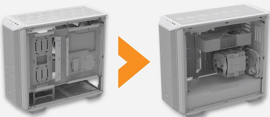 Modulaire kast: Met als klap op de vuurpijl kun je binnen een paar eenvoudige stappen het moederbord tray en voeding kap de andere kant op installeren. Hiermee zit de videokaart boven en de CPU beneden. Ter illustratie: